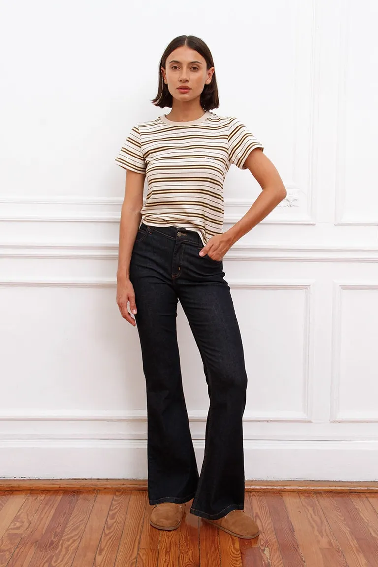 Jean de corte bootcut con tiro medio y ajuste cómodo. Diseño versátil con detalles personalizados y acabado clásico, ideal para completar outfits cotidianos con estilo y practicidad.