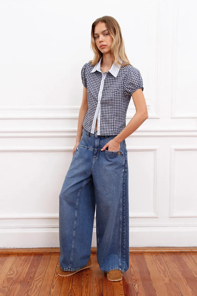 Pantalón de estilo wide leg con tiro medio y corte holgado. Presenta detalles de recortes en delantero y espalda, con avíos metálicos y diseño funcional con bolsillos. Una prenda versátil para combinar en cualquier outfit diario con un calce cómodo y moderno.