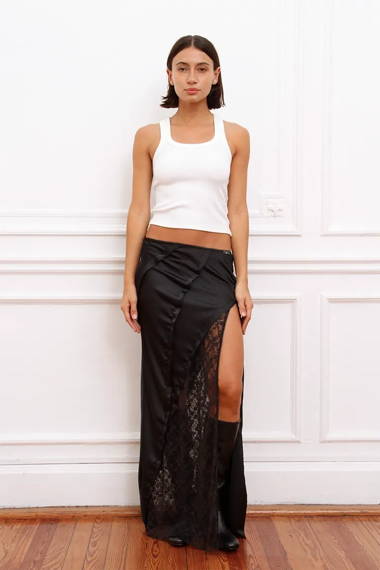 Pollera larga con diseño evasé, detalles de encaje y tajo lateral que aporta movimiento. Presenta un estilo fluido, elegante y sofisticado ideal para combinar en diversos outfits.