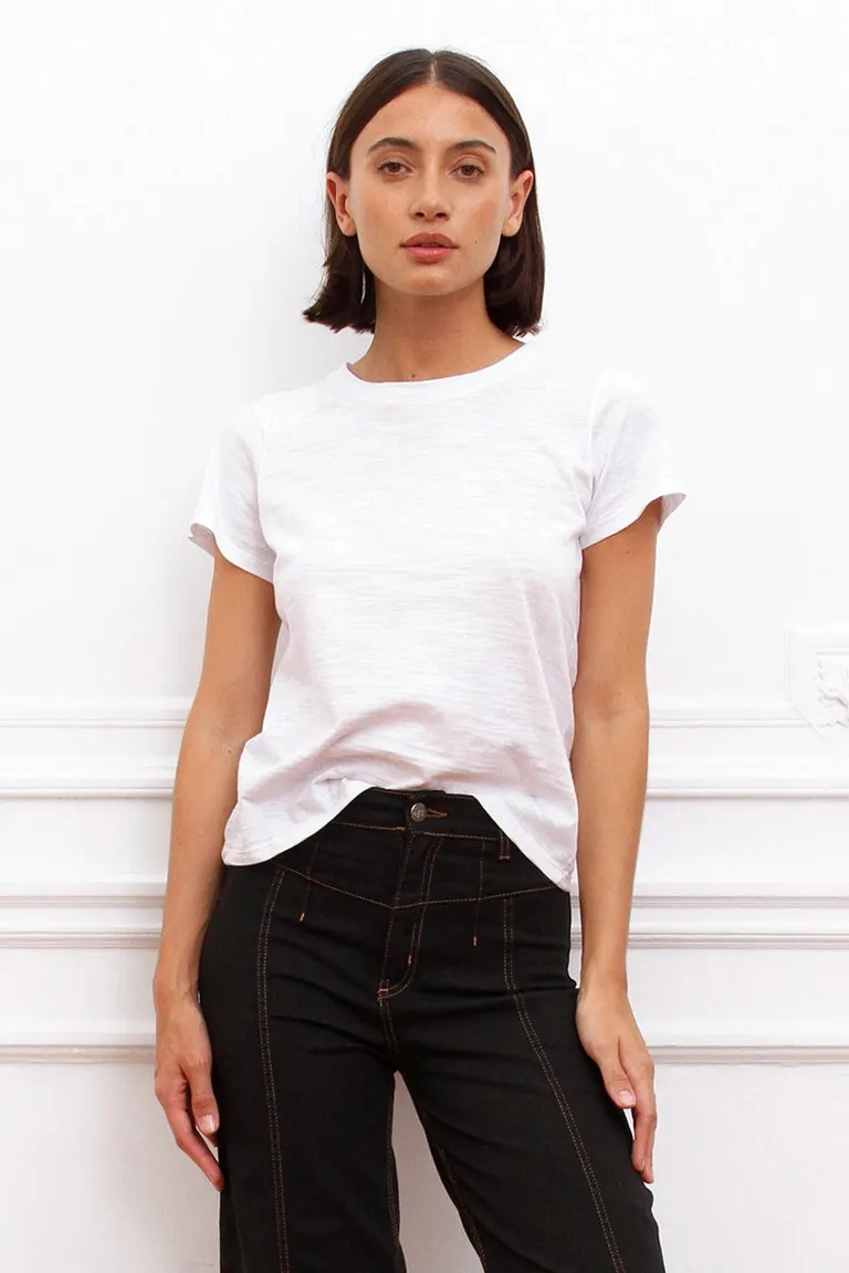 Remera de corte clásico con manga corta y cuello redondo. Una prenda esencial de diseño sencillo y versátil, ideal para combinar en cualquier ocasión de uso diario.