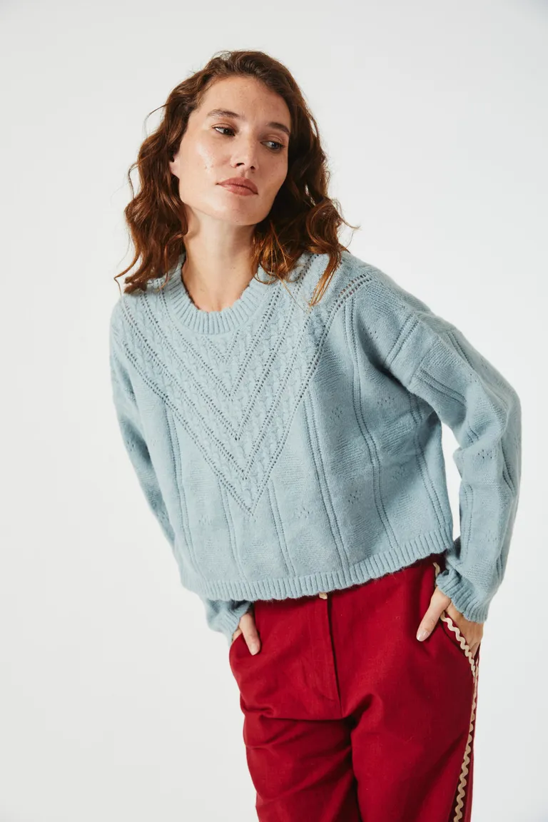 Suéter tejido de punto en una suave textura que brinda calidez y comodidad. Perfecto para lucir un estilo casual y elegante en cualquier ocasión. Ideal para complementar tus looks de temporada con un toque femenino y otoñal.