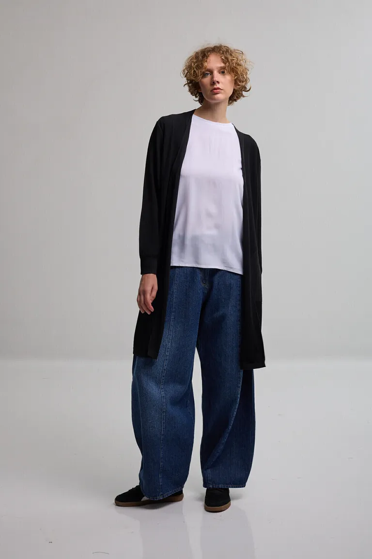 Este cómodo y elegante cardigan de hilo largo con mangas largas y bolsillos laterales es la prenda perfecta para complementar cualquier look. Ideal tanto para ocasiones casuales como formales, su diseño versátil lo convierte en una pieza indispensable en el armario de toda mujer.