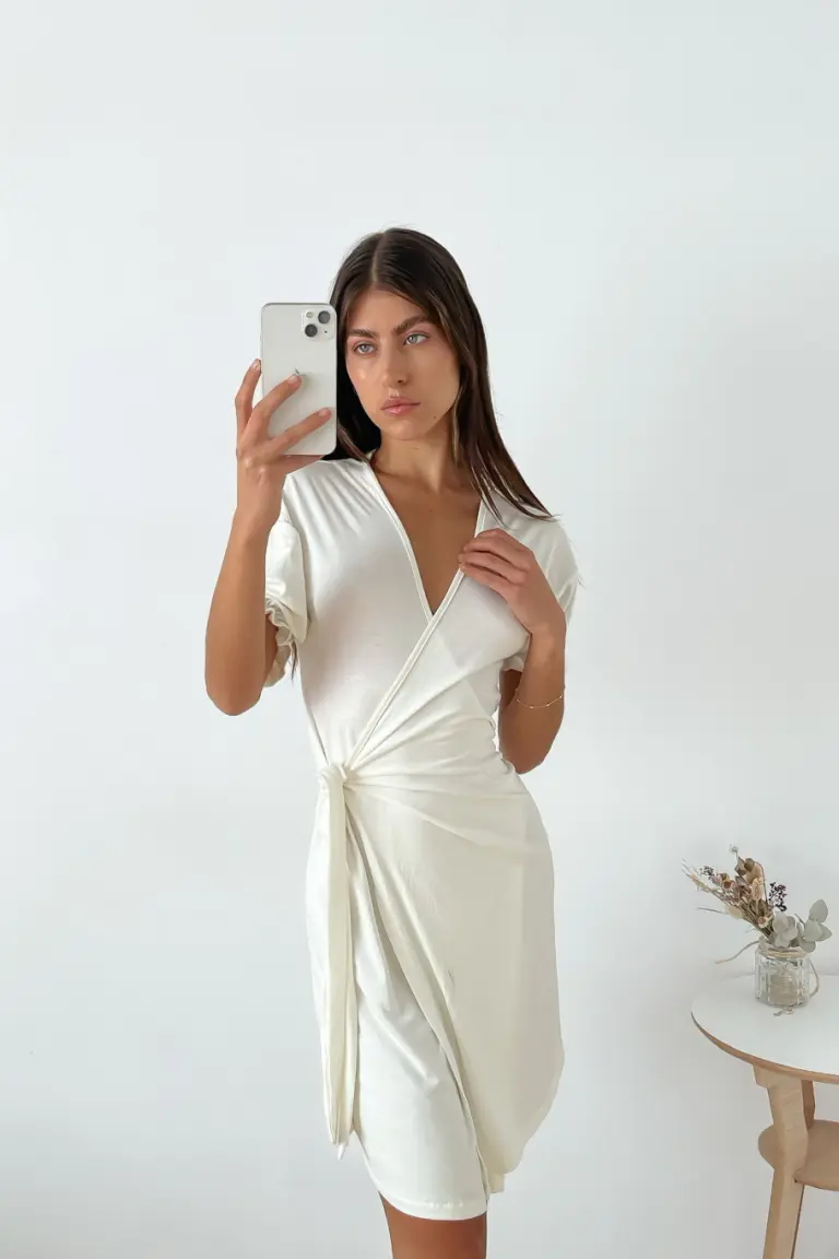 Elegante vestido modal con diseño cruzado y lazo para atar, perfecto para cualquier ocasión. Prenda versátil y cómoda que se adapta a diferentes estilos y siluetas. Ideal para completar looks casuales o semiformales con un toque femenino y sofisticado.