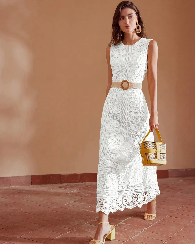Elegante vestido sin mangas con un diseño de encaje y volantes en el dobladillo. Perfecto para eventos formales o ocasiones especiales. Su estilo refinado y silueta entallada lo convierten en una opción versátil que se adapta a diferentes estilos y ocasiones.