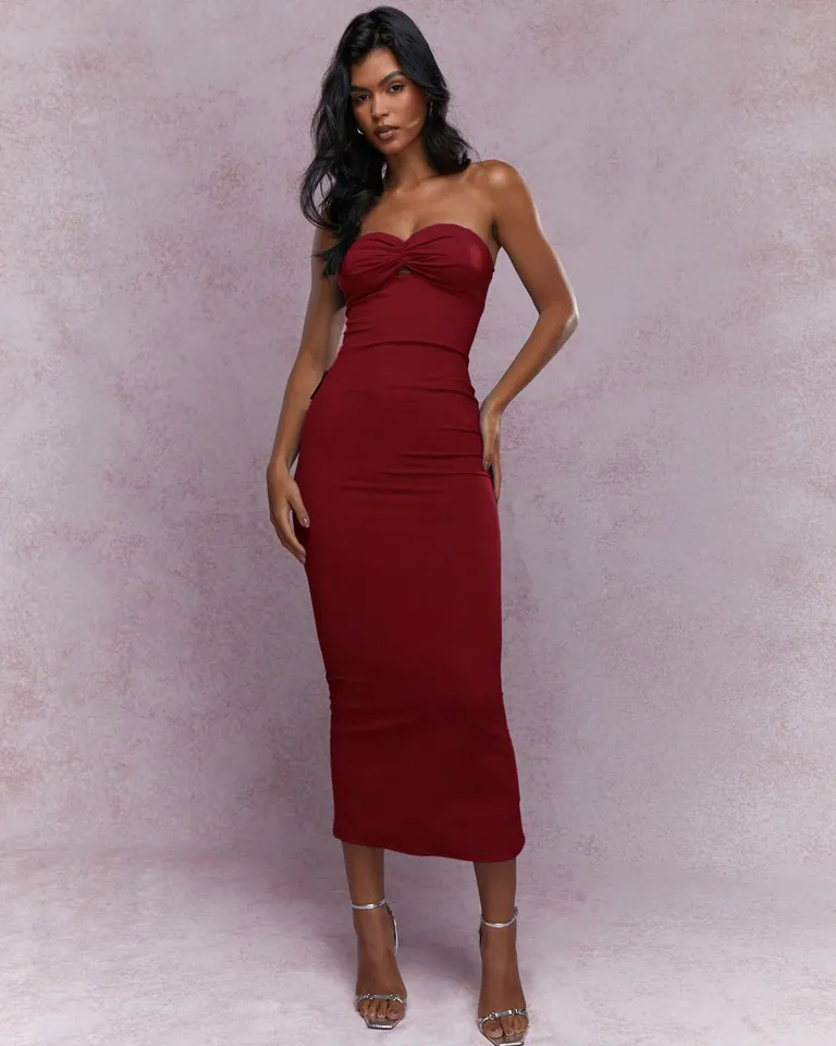 Este elegante vestido de noche, ajustado y sin tirantes, es perfecto para ocasiones especiales como fiestas, eventos sociales y bodas. Diseñado en un hermoso tono azul, el vestido midi realza tu silueta y te hará lucir radiante. Combínalo con accesorios apropiados para crear un look sofisticado y lleno de estilo.