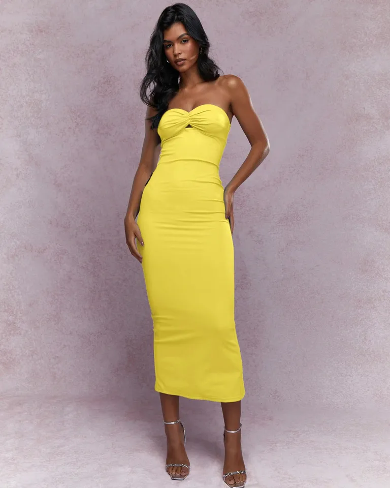 Este elegante vestido de noche, ajustado y sin tirantes, es perfecto para ocasiones especiales como fiestas, eventos sociales y bodas. Diseñado en un hermoso tono azul, el vestido midi realza tu silueta y te hará lucir radiante. Combínalo con accesorios apropiados para crear un look sofisticado y lleno de estilo.