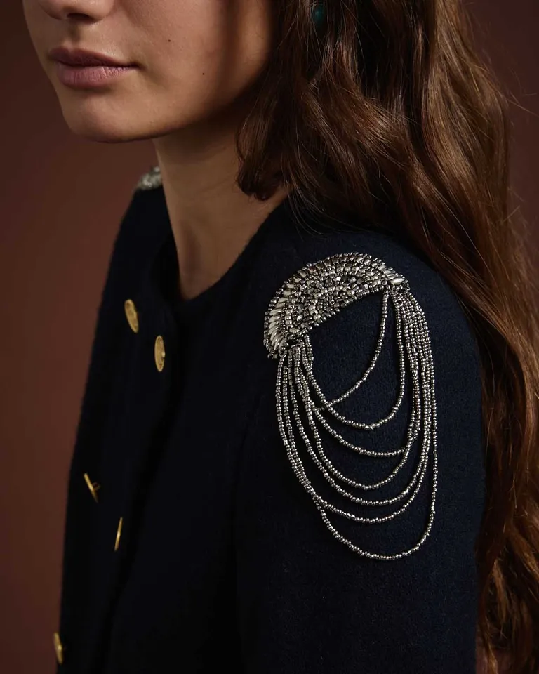 Blazer de diseño estructurado con detalle distintivo de charreteras metálicas en los hombros. Presenta un cierre frontal con botones dorados que aportan un toque clásico y sofisticado. Esta prenda es ideal para complementar looks formales o elevar un outfit casual, ofreciendo una silueta entallada y elegante que destaca por su confección y terminaciones detalladas en el área de los hombros.