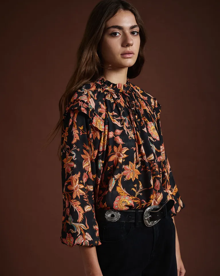 Blusa de mangas largas con volados en hombros, escote con lazos y diseño estampado de Wanama