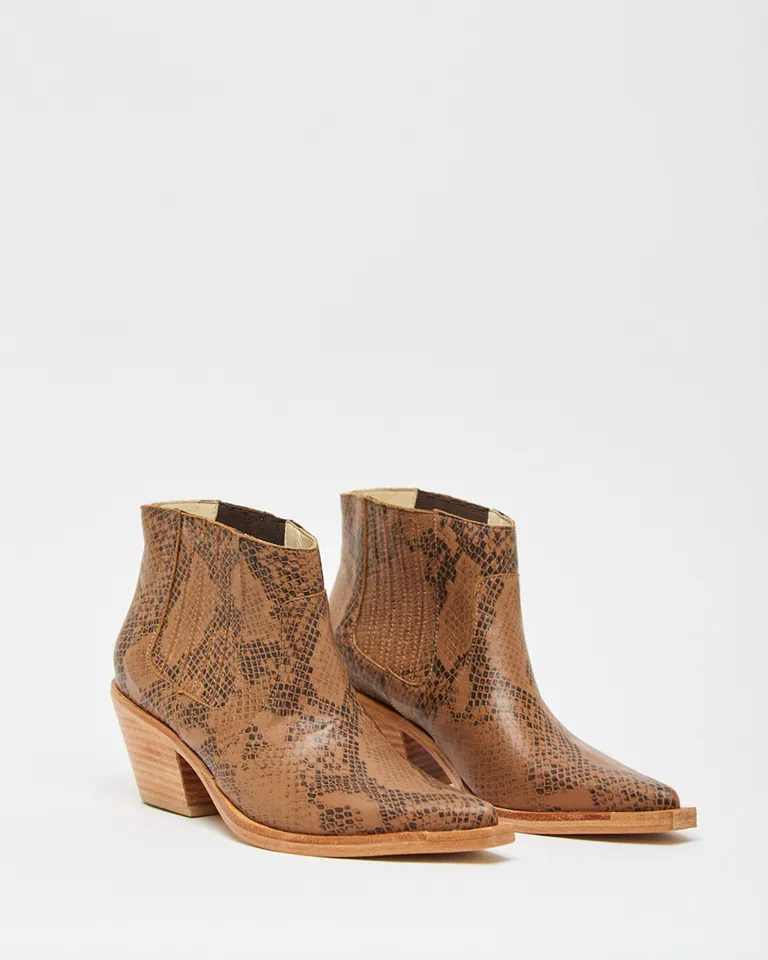 Botas de caña baja con diseño de reptil, ideales para complementar cualquier look. Presentan una terminación en punta y taco medio, ofreciendo un equilibrio perfecto entre comodidad y estilo sofisticado. Un diseño versátil y atemporal, pensado para quienes buscan un calzado con personalidad y presencia.