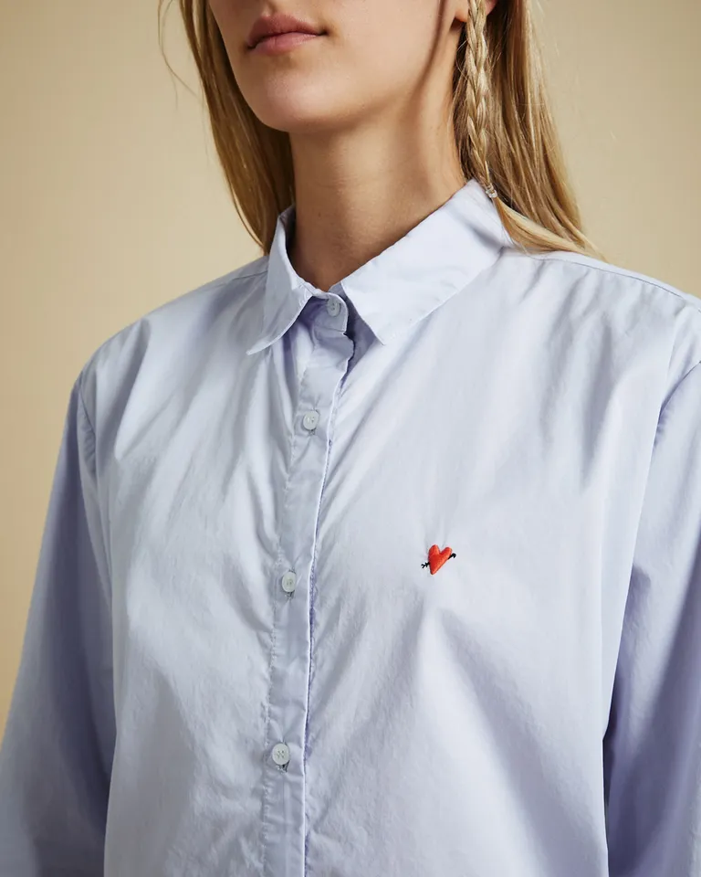 Camisa de calce oversize con cuello clásico, cartera con botones a la vista y puños ajustables. Presenta un detalle de bordado minimalista en el frente izquierdo que le otorga un toque distintivo. Ideal para lograr un look casual y versátil en el uso cotidiano.