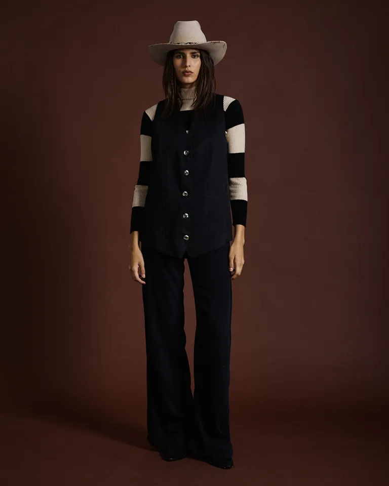 Chaleco sastrero de diseño clásico con cartera de botones frontales y detalle de bolsillos ojal. Esta prenda versátil es ideal para completar looks formales o urbanos, aportando estructura y elegancia a cualquier conjunto. Cuenta con una cinta de ajuste en la espalda para un calce perfecto.