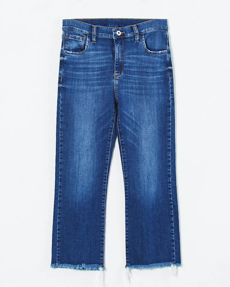 Pantalón de jean con diseño de tiro alto y pierna recta que ofrece un ajuste cómodo en la cintura y cadera. Presenta un estilo clásico con terminaciones de ruedo desflecado, ideal para completar equipos informales con un toque distintivo. Esta prenda versátil es un esencial en cualquier guardarropa por su estructura resistente y corte moderno.