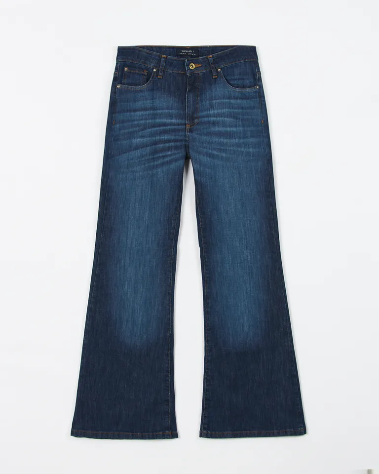 Jean tiro alto con botamanga acampanada y lavado con efecto desgastado de Wanama
