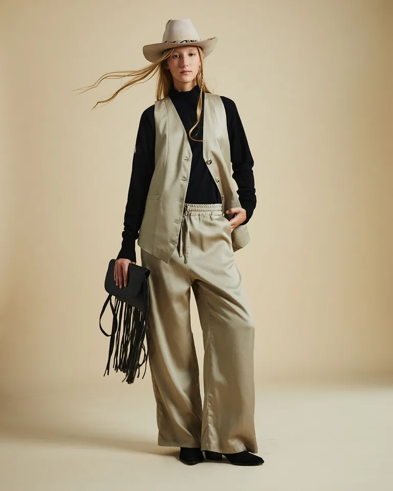 Pantalón de corte amplio con diseño fluido, ideal para lograr un look relajado y elegante en cualquier ocasión. Cuenta con cintura elastizada y cordón de ajuste para brindar mayor comodidad durante el uso diario. Presenta bolsillos laterales funcionales y una caída suave que acompaña el movimiento natural del cuerpo, ofreciendo versatilidad para combinar con distintas prendas superiores.