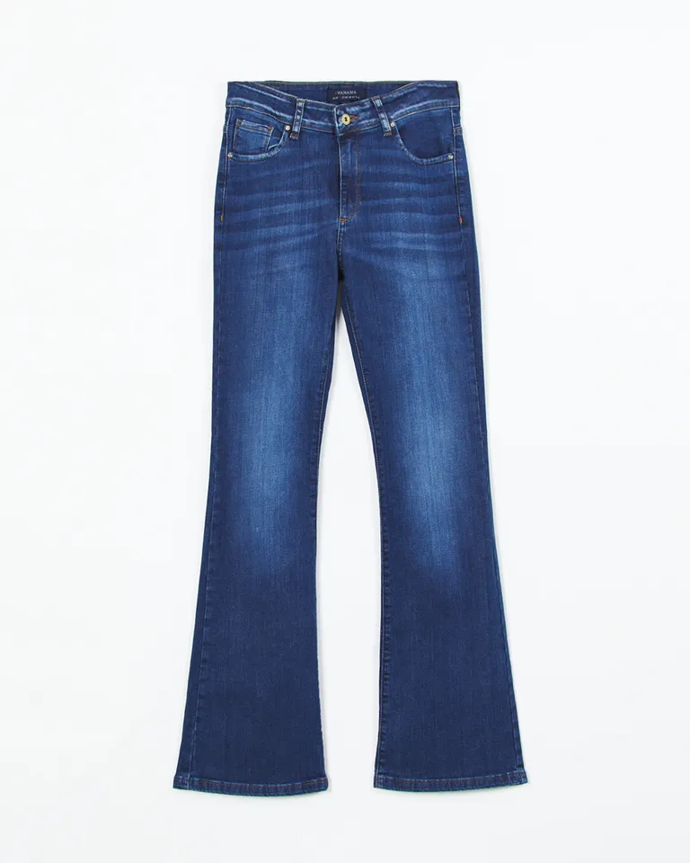 Pantalón tipo jean con corte boot cut y tiro alto. Presenta una silueta ajustada desde la cadera hasta el muslo, con una ligera apertura en la parte inferior desde la rodilla. Diseño clásico con bolsillos frontales y traseros, ideal para combinar en diversos outfits diarios.