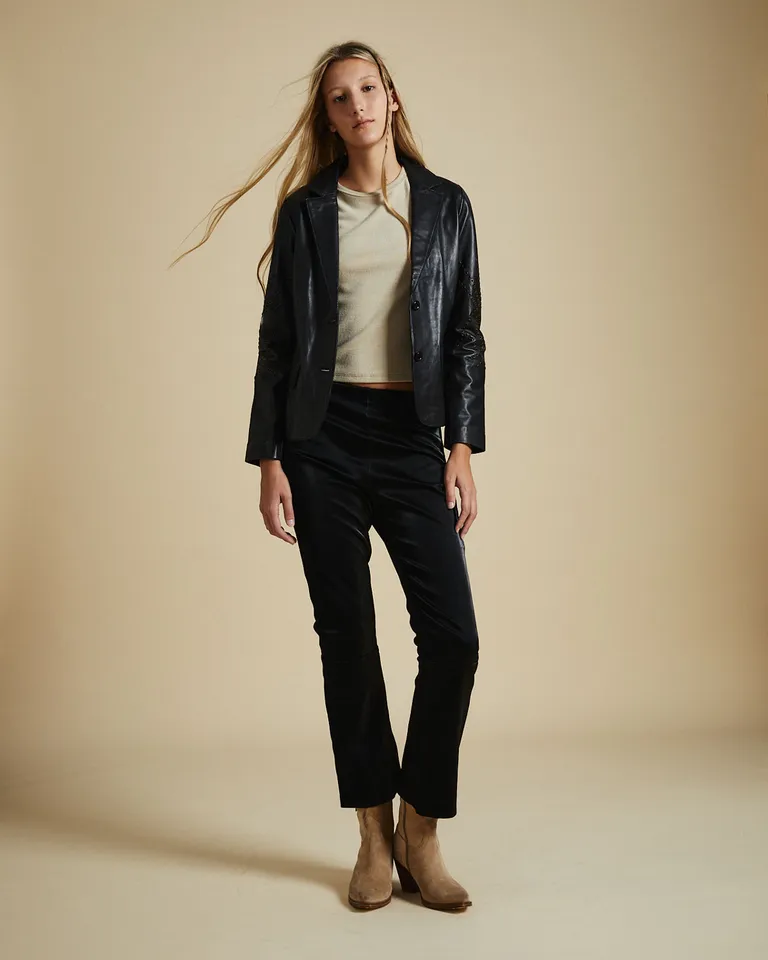 Pantalón de mujer con textura distintiva y diseño estructurado. Presenta un corte con recortes en las piernas y pinzas en la espalda para un calce preciso, junto con una cintura elástica interna y cierre invisible lateral. Una prenda versátil y moderna, ideal para completar equipos formales o casuales con estilo propio.