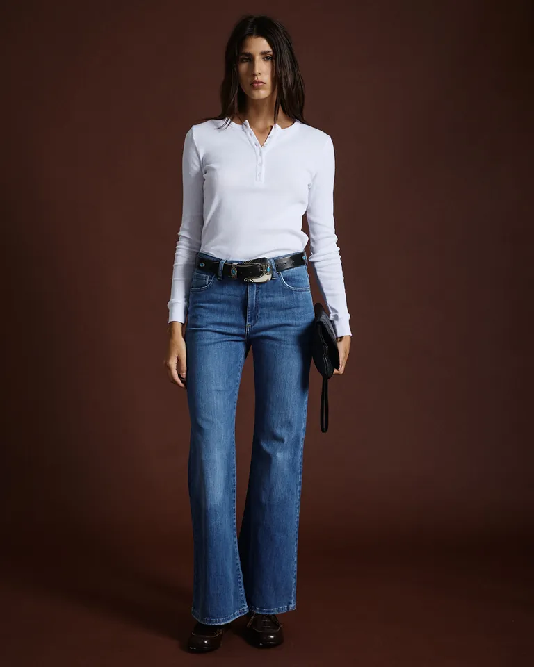 Jean de corte acampanado con tiro medio, diseñado para ofrecer una silueta favorecedora y cómoda. Este modelo combina un estilo clásico de cinco bolsillos con un acabado de efecto desgastado, ideal para completar equipos informales o urbanos. Presenta un ajuste entallado que se ensancha gradualmente hacia el ruedo, aportando versatilidad para diversas ocasiones.