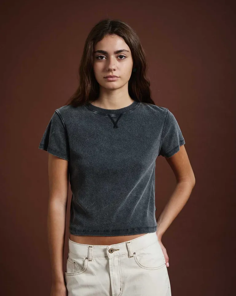 Remera de corte clásico con cuello redondo y detalle de costura decorativa. Presenta un acabado con efecto de teñido desgastado que aporta una estética casual y relajada. Ideal para combinar con diversas prendas inferiores, brindando comodidad y versatilidad para el uso diario en diferentes ocasiones urbanas.