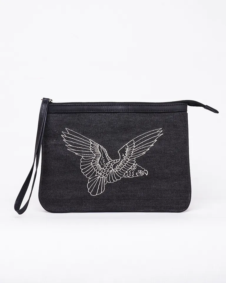 Sobre estilo cartera con cierre superior y correa de mano. Presenta un diseño central bordado de un ave en vuelo, ideal para llevar tus pertenencias de forma organizada y práctica en cualquier ocasión. Un accesorio versátil que completa cualquier conjunto con un detalle distintivo y funcional.