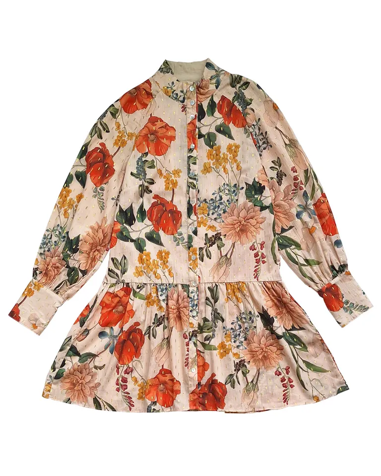 Vestido corto de estilo romántico con diseño floral, cuello alto y cierre frontal de botones. Presenta mangas largas con puños ajustados y un detalle de volado en la parte inferior que aporta movimiento. Una prenda versátil y delicada para el guardarropa femenino, ideal para diversas ocasiones de uso.