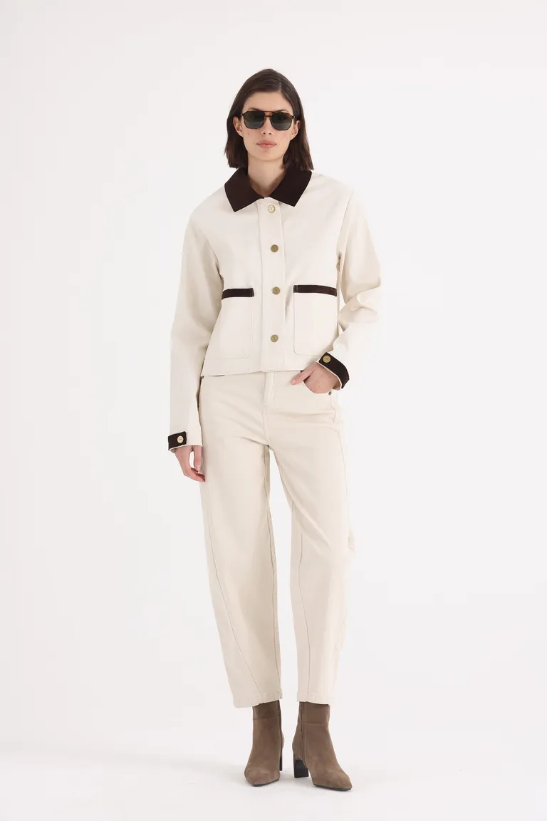 Camisaco estructurado con cierre frontal y detalles de contraste en cuello, puños y bolsillos. Una prenda versátil y funcional con calce relajado, ideal para completar outfits urbanos de media estación. Su diseño práctico permite crear combinaciones tanto casuales como más formales para el día a día.