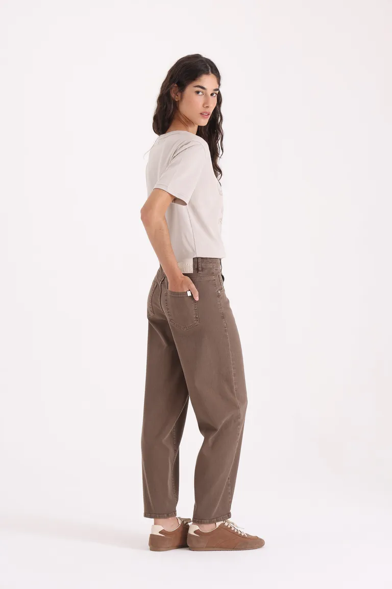 Pantalón de mujer con corte barrel y tiro medio. Su diseño presenta una silueta relajada con pierna amplia que ofrece comodidad y libertad de movimiento. Ideal para un uso diario y urbano, es una prenda versátil y funcional para completar diversos conjuntos. Su calce favorecedor permite integrarlo fácilmente en looks informales o de trabajo, manteniendo siempre un estilo moderno y equilibrado.