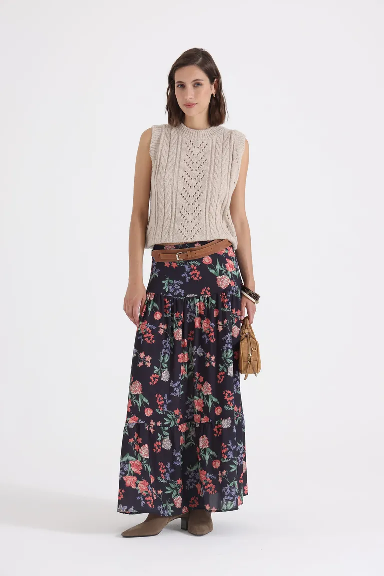 Pollera larga de estilo fluido con diseño floral, ideal para lograr un look relajado y con movimiento. Presenta un corte cómodo que acompaña el cuerpo, perfecta para diversas ocasiones durante el día. Su caída liviana ofrece frescura y versatilidad para combinar en outfits diarios. Una prenda clave que destaca por su diseño dinámico y natural.
