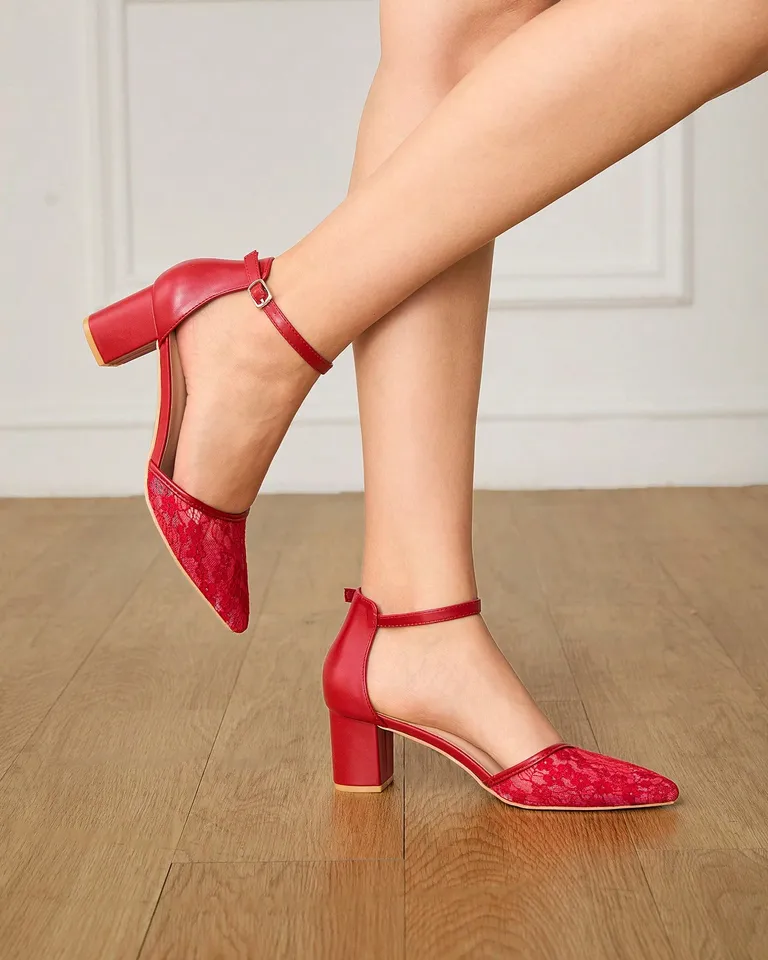 Elegantes zapatos de novia con detalles de encaje en la punta y tacón bloque, perfectos para complementar tu look en una boda, celebración de Año Nuevo o velada romántica. Estos zapatos aportan un toque sofisticado y atemporal a cualquier atuendo, haciéndolos ideales para la temporada otoño-invierno y el Día de San Valentín.